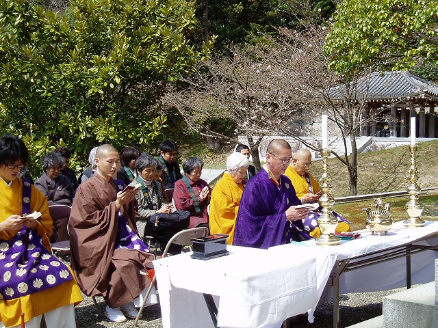 ![]() 去る3月20日午後1時より、春彼岸全体供養が宝塔前にて行われました。前日の雨で天気が心配されましたが、当日は風が強かったのですが、お天気は良くて屋外で行なうことができました。 連休の初日であったため、午前中よりたくさんのお参りの方が来園されていらっしゃいましたが、午後1時ごろは昼食の時間ということもあり、参加の方が20名程で少なかったのが残念でした。 けれども、参加された方の中には、今回初めての参加でわざわざ関西からお見えの方もいらっしゃいまして、蓮華院御廟のすばらしい景観とお参りのお陰で、身も心も癒されましたと喜んで頂きました。 次回は8月のお盆全体供養ですので、今回お時間が合わなかった方は、ぜひ時間を合わせて次回お参りに来て頂ければと思います。 現在霊園の桜は満開です。霊園の一年の中で今の季節が一番綺麗な時期です。先週の週末28-29日は花見を兼ねてのお参りの方々が多かったようです。 これから並木の桜は春風が吹くたびに桜吹雪で散ってしまいますが、管理棟前の枝垂桜は来週末頃が見頃と思います(写真のとおり現在4分咲き程度)。カメラとお弁当を持ってお墓参りはいかがでしょうか。